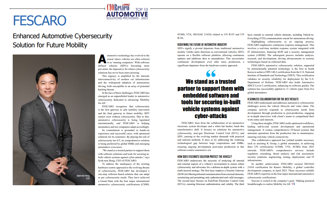 “We stand as a trusted partner to support them with software solutions and tools for securing in-built vehicle systems against cyber-attacks,” says Seok-min Hong, CEO of FESCARO.