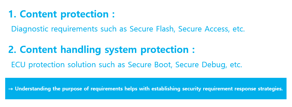 As mentioned earlier, OEMs' security requirements are divided into requirements to protect communication data inside/outside the ECU and requirements to protect the ECU itself.