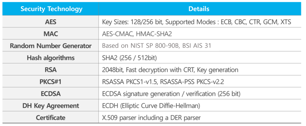 In terms of cryptographic security technology, there are requirements for AES-128/256 encryption/decryption, message authentication codes such as AES-CMAC and SHA2 HASH, signature verification techniques such as RSA-based PKCSv1.5, v2.2, ECC-based ECDSA, X.509 certificate management, and random number generation methods based on NIST SP 800-90B and BSI AIS 31 standards. Especially in recent years, OEMs are demanding more secure technologies such as the Secure Flash function based on the ECDSA signature verification technique using an elliptic curve, and also the message-based Secure Access function that verifies the integrity of the diagnostic message itself, rather than a simple Seed & key authentication technique.