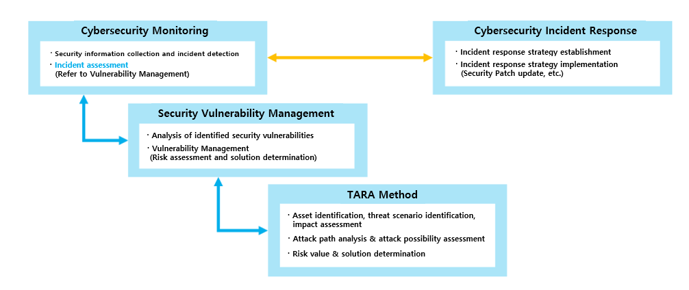 It is essential to implement and operate a security management system that is closely connected with both customers and suppliers. To explain in more detail, we gather information related to cybersecurity, and through this, we identify if any security incidents have taken place. Security incidents that have been identified are assessed based on the vulnerability management process. In the vulnerability management process, the TARA methodology is employed to scrutinize identified security vulnerabilities, gauge the associated risks, and devise appropriate counteractions. Also, it tracks and manages the remediation of identified vulnerabilities throughout the entire life cycle of the vehicle. For security incidents evaluated using this approach, corrective actions will be implemented in line with the incident response procedure. Steps such as crafting an incident response plan and updating security patches will be undertaken.