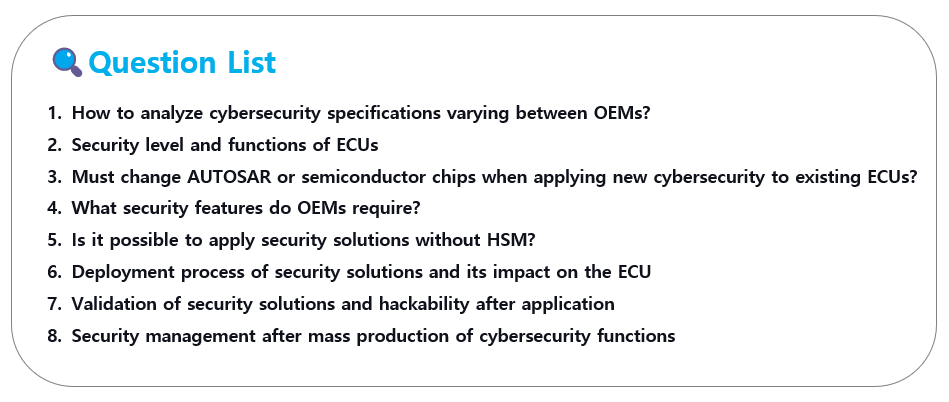 The webinar tackled eight prominent concerns, consolidating frequently asked questions from Tier companies and queries received during pre-registration. To offer precise insights, we assembled a panel of experts, with an average experience of over 20 years. Why not delve into the insightful responses from CEO Hong Seok-min, an authority on automotive cybersecurity, Director Ku Seong-seo, a specialist in automotive software development, and Team Leader Yang Hee-guk, an expert in automotive engineering?