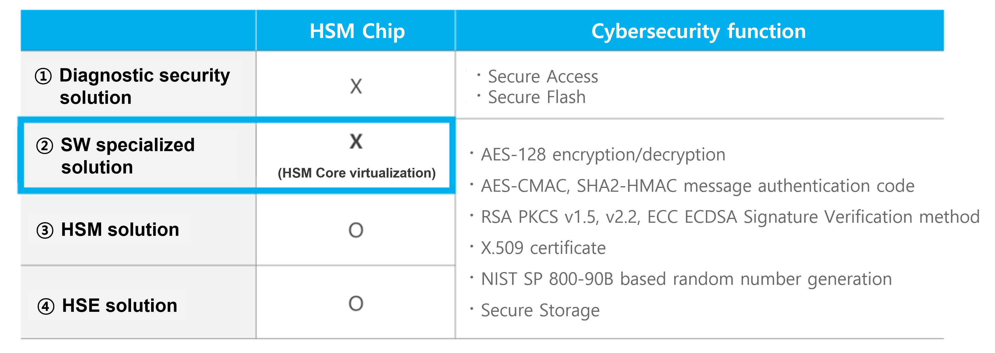 The ‘diagnostic security solution’ provides Secure Access and Secure Flash functions essential for diagnostic communication even without HSM. The ‘SW specialized solution’ is a security solution that virtualizes the HSM hardware core in software, and provides security functions equivalent to HSM, although it has a lower level of security compared to HSM hardware solution. The ‘SW specialized solution’ supports AES-128 encryption/decryption, AES-CMAC, SHA2-HMAC message authentication code, RSA PKCS v1.5 and v2.2 Signature Verification, X.509 certificate management, NIST SP 800-90B based random number generation, and Secure Storage function using Data Flash and MPU functions in MCU.