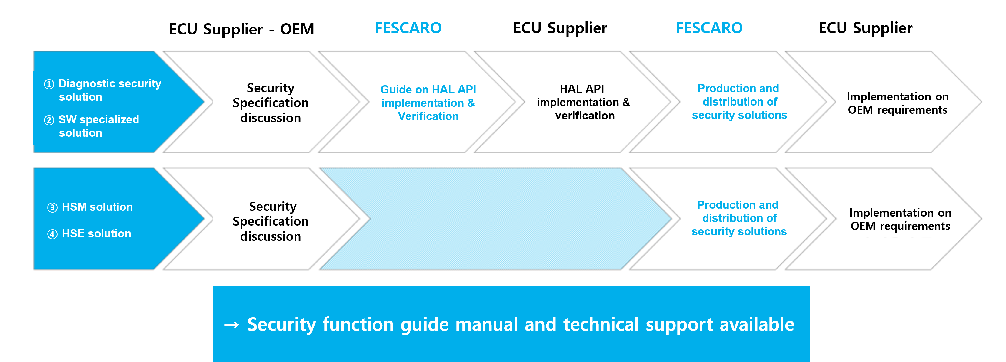 ‘Diagnostic security solution’ and ‘SW specialized solution’ require the use of hardware resources such as the Data Flash within the ECU's MCU, MPU, and timer, so there may be a HAL API that needs to be implemented by the ECU supplier. FESCARO provides detailed guide manuals and verification libraries required to implement the HAL API. Once the HAL API has been implemented and verified, you can implement OEM's requirements by utilizing the security solutions deployed such as the HSM and HSE solution integration procedures.