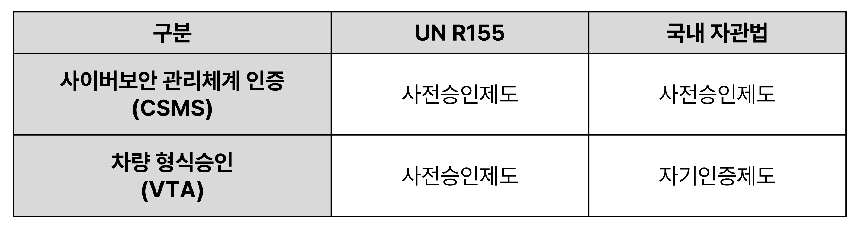 UN은 ‘사전인증제도’를 적용해 차량 판매 전에 두 가지 인증을 모두 취득해야 합니다. 반면, 자관법은 차량 제작사가 자동차 안전기준 적합 여부를 스스로 인증한 후 차량을 판매하며, 정부가 이를 사후에 점검하는 ‘자기인증제도’가 원칙입니다. 다만, CSMS 인증은 예외적으로 사전승인 제도를 도입했고, VTA는 기존의 자기인증제도를 유지하는 것이 UN R155와의 가장 큰 차이점입니다.