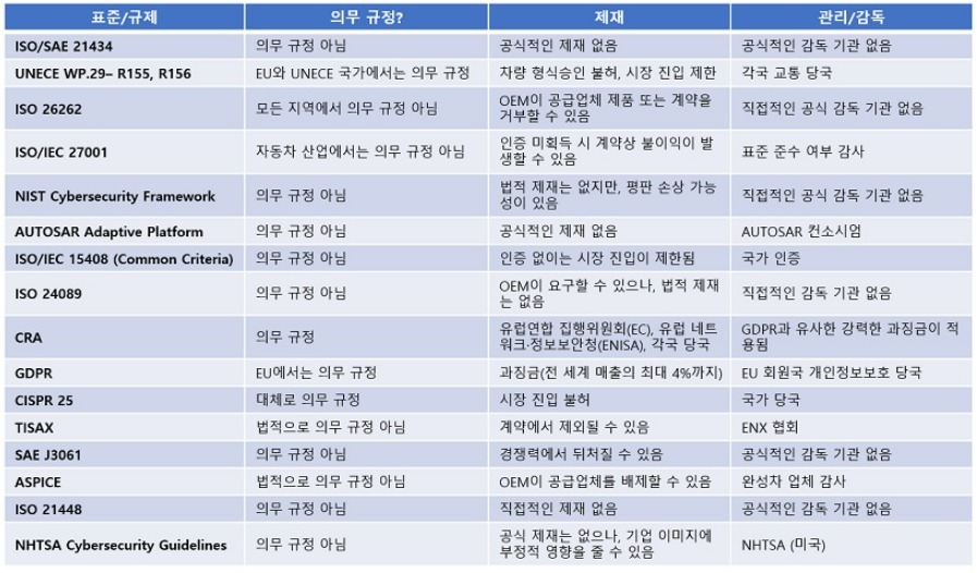 by AEM(오토모티브 일렉트로닉스 매거진)주요 표준 및 규제 개요 (출처 = AEM)16개 국제 표준과 규제를 분석한 결과, 강제력·구체성·공급망 위험 대응 등에서 불균형이 드러났습니다. 모든 위협을 포괄하는 단일 표준이 존재하지 않아 업계는 ‘퍼즐 조각 같은 규제 환경’에 대응하고 있습니다. 이에 따라 ▲다층적 보안 전략, ▲규제의 명확성과 집행력 강화, ▲투명한 데이터 관리, ▲공급망 전체 보안 책임 확립이 핵심 개선 방향으로 제안되었습니다.2. [워크숍] 2025 알아야 할 게 많은 자동차 사이버보안by 한국자동차공학회 사이버보안연구회▶ 2025년 10월 20일(월) 13:00 ~ 18:40▶ 서울 성북구, 국민대학교 본부관 학술회의장