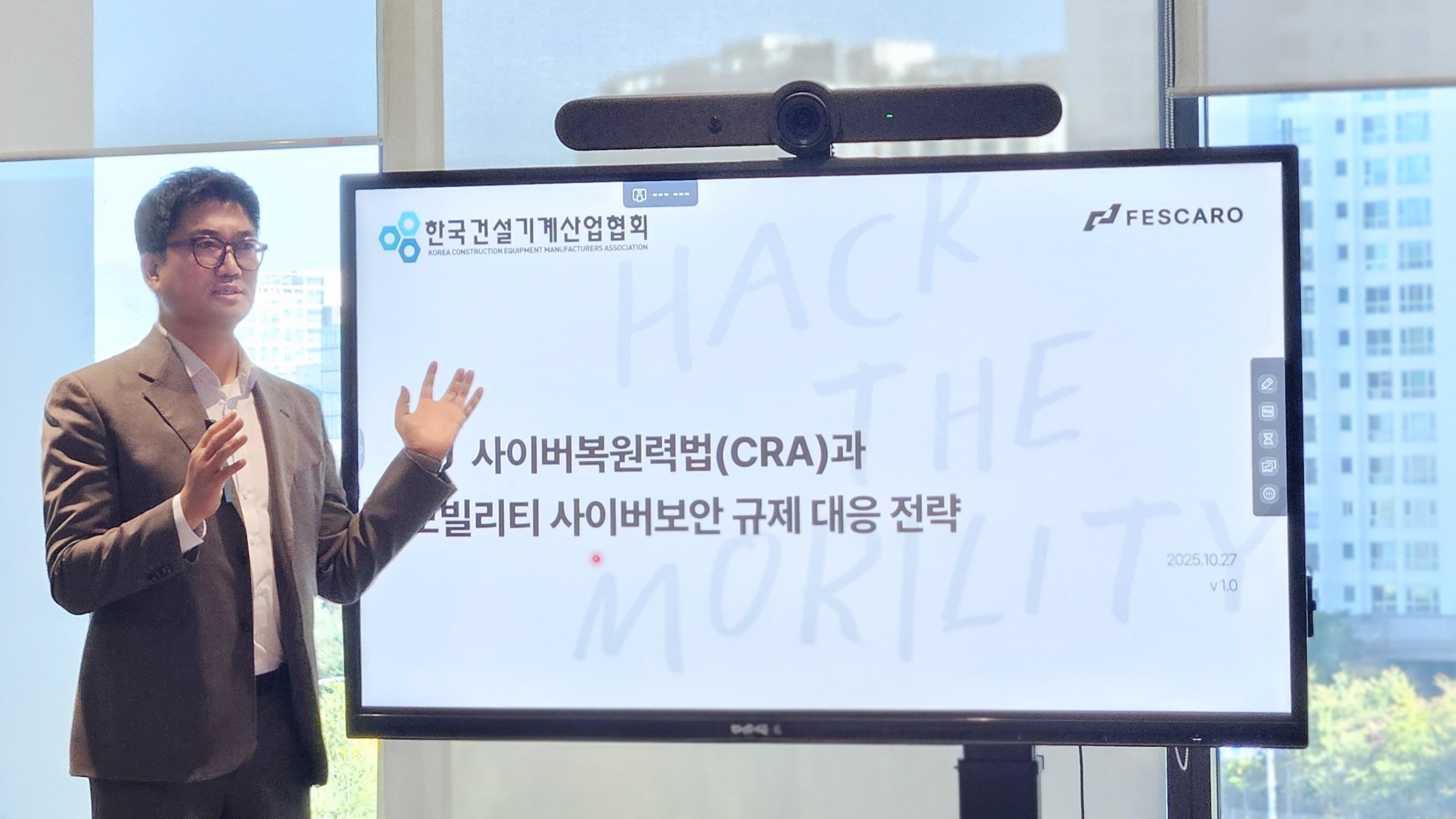 페스카로(FESCARO)가 국가기술표준원(KATS) 주최, 한국건설기계산업협회(KOCEMA)와 HD현대사이트솔루션 주관으로 열린 ‘산업용트럭 사이버보안 엔지니어링 고유표준 제정 공청회’에서 사이버보안 강연을 진행했다고 7일 밝혔다.