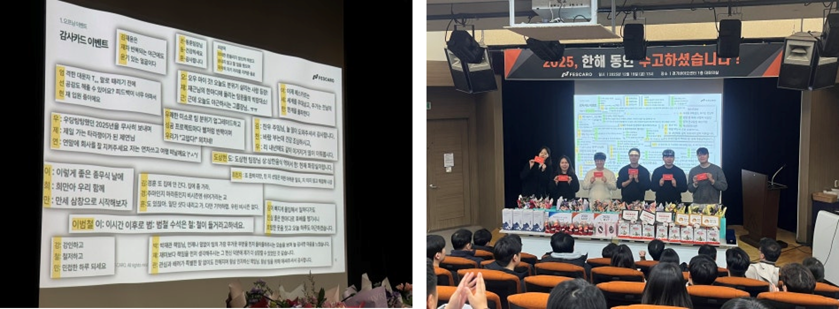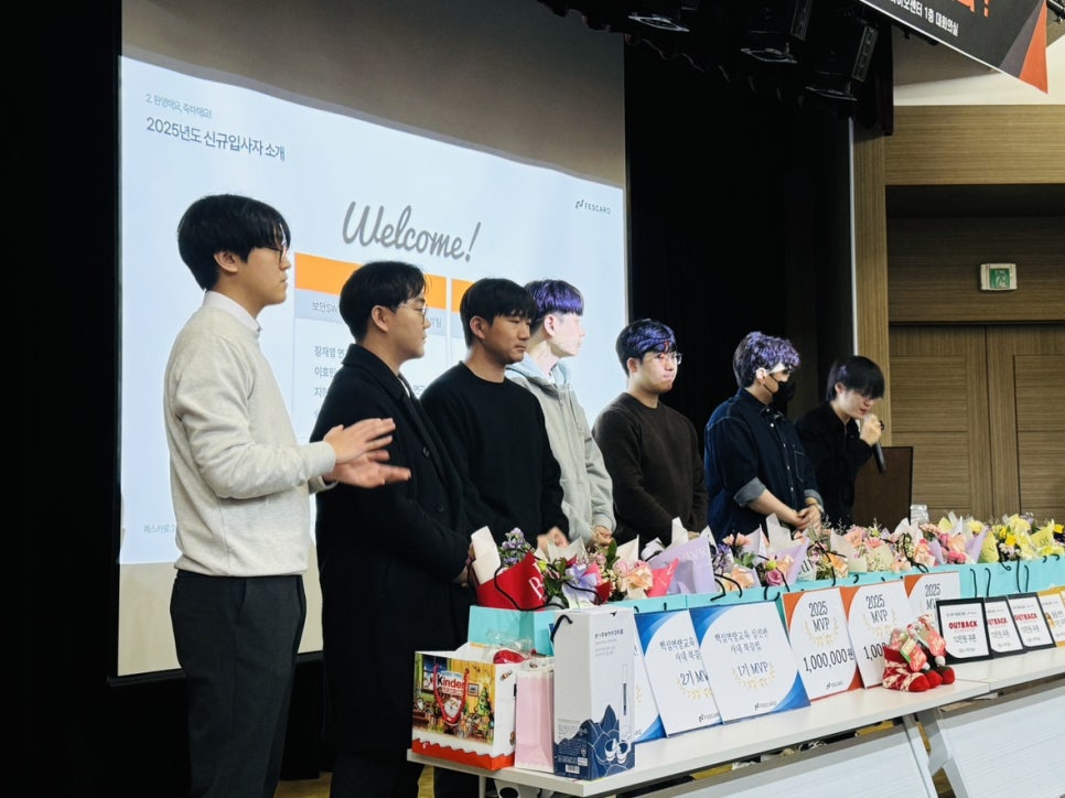 먼저 2025년 하반기 신규 입사자 소개 시간을 가졌습니다. 각자의 개성이 담긴 단단한 자기소개와 함께, 페스카로에 합류한 이후의 일상을 나누며 서로를 더 알아갈 수 있었던 뜻깊은 시간이었습니다. 이어진 박수 속에는 새로운 동료들을 향한 환영과 응원의 마음이 담겨 있었습니다.