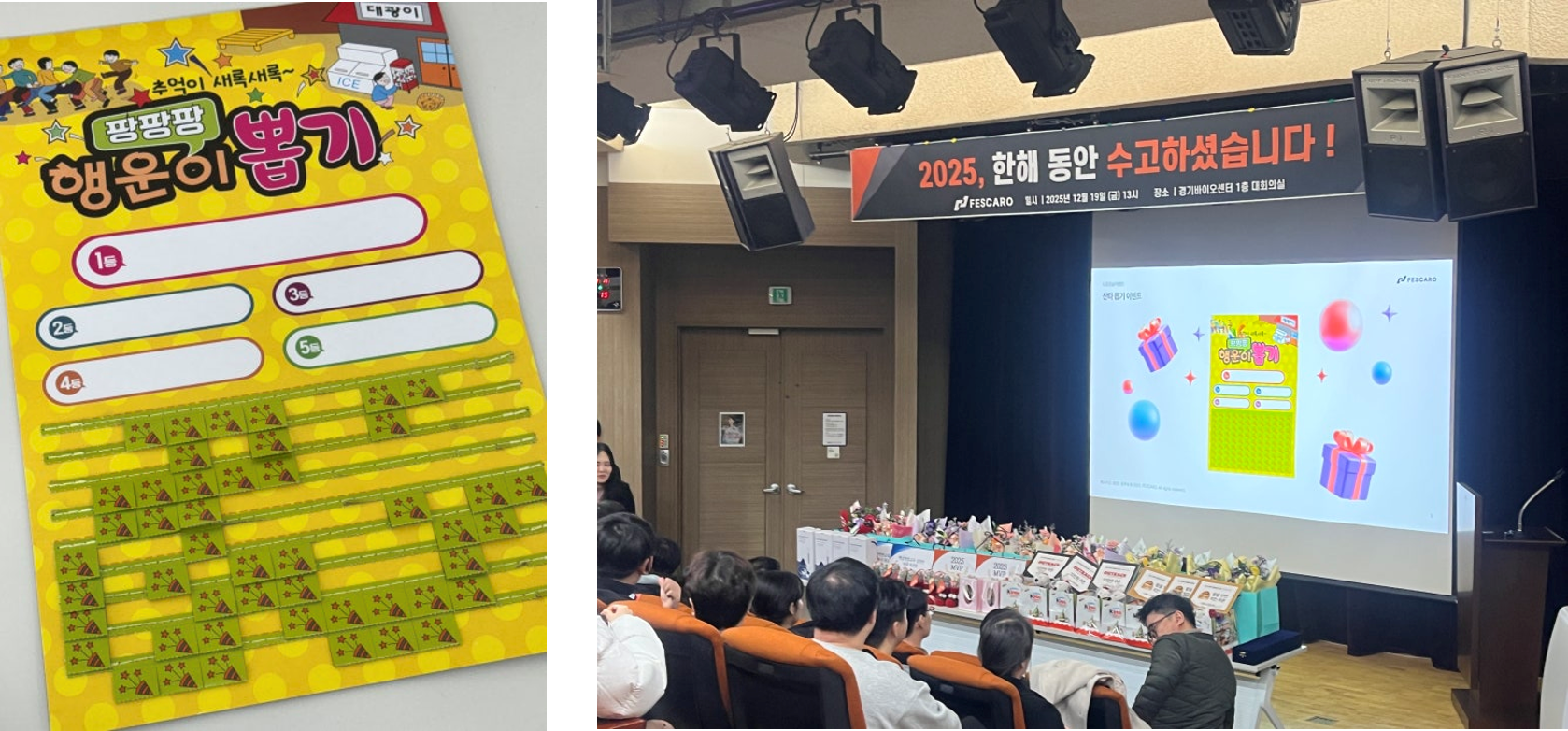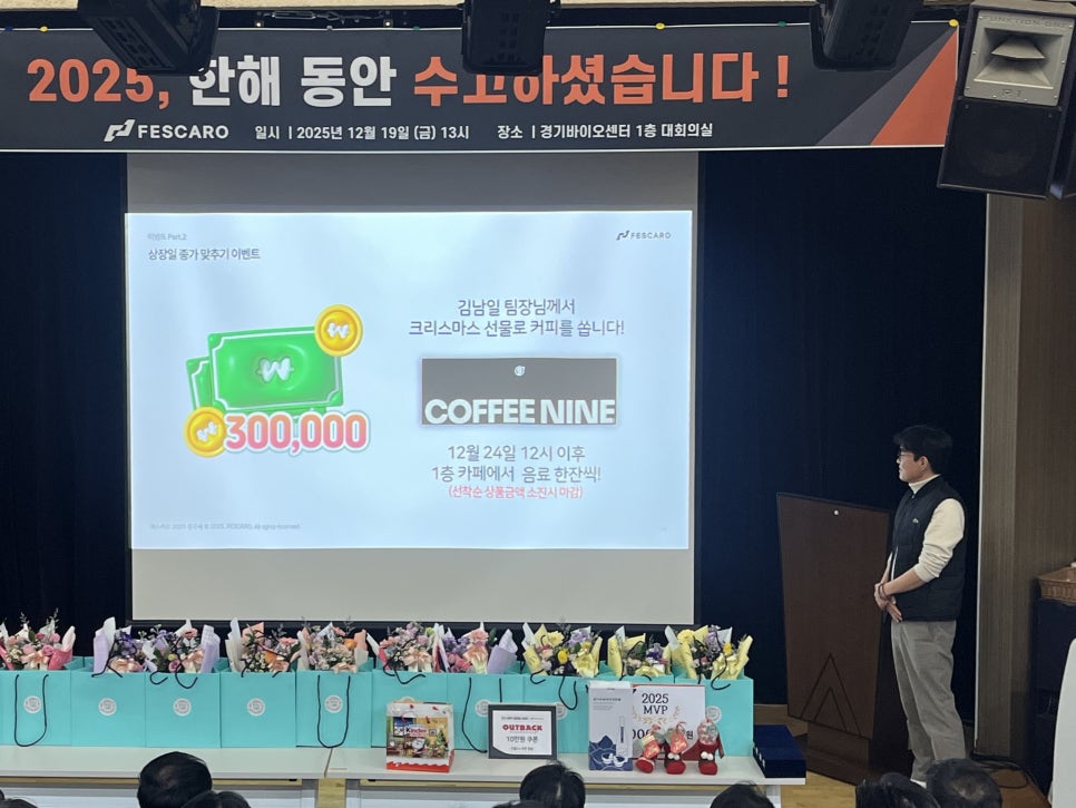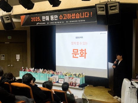 페스카로는 2025년 한 해를 마무리하고 새로운 도약을 준비하는 종무식을 진행했습니다. 올해는 페스카로가 ‘기술특례상장’이라는 큰 이정표를 세운 해인 만큼, 임직원 모두에게 더욱 뜻깊은 하루가 되었습니다. 오프닝 이벤트와 함께 행사의 막이 올랐습니다. 임직원들의 웃음소리와 힘찬 박수가 이어지며, 현장 분위기도 빠르게 달아올랐습니다.