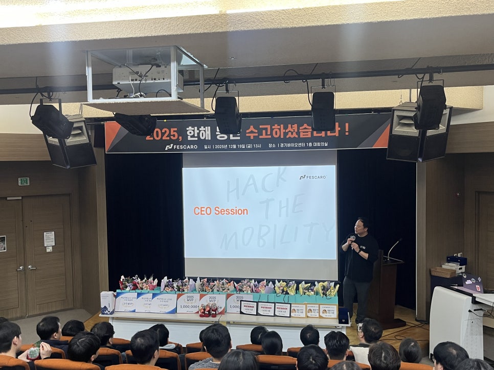 홍석민 대표님은 상장을 준비하는 과정의 의미와 그동안의 여정에 대해 이야기를 나누며, 2025년 실적과 전사 KPI를 함께 짚어보는 시간을 가졌습니다. 페스카로가 나아가고자 하는 비전과 목표를 다시 한번 상기하며, 앞으로의 방향성을 함께 그려볼 수 있는 의미 있는 세션이었습니다. 이후 진행된 Leadership Session에서는 전장사업본부, 사이버보안사업본부, 글로벌사업개발본부, 경영관리본부의 리더들이 공유하는 현황 보고와 사업 목표 및 계획을 확인할 수 있었습니다. 타 부서의 방향성과 이야기를 들으며, 전사 목표에 함께 얼라인하고 공감할 수 있었습니다.