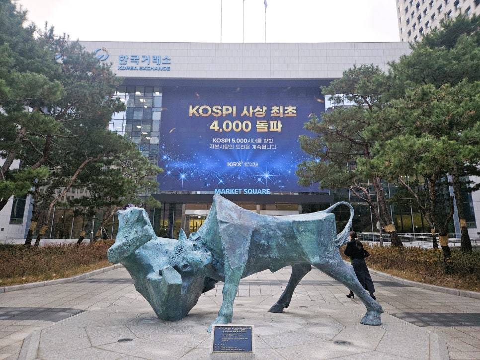 상장기념식을 위해 여의도의 한국거래소로 향했습니다. 건물 앞에는 하락장을 의미하는 곰, 상승장을 의미하는 황소 동상이 있었습니다. 힘차게 곰을 들이받는 황소의 모습이 인상적이었습니다.